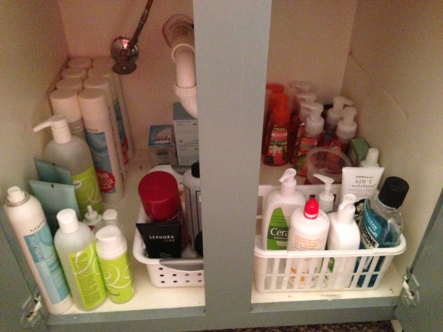 So that is how I have organized my products. Bins, buckets, and the Lucite drawers seem to be the key to organization for me. Having a place where you always keep stuff. I have the same type of system in my nightstand to keep lip gloss, lotion, etc from getting too out of hand.